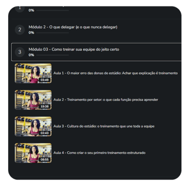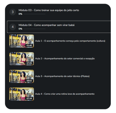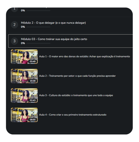 → Aqui você vai aprender a estruturar um treinamento por setor — comercial, recepção, instrutoras, administrativo — com base em clareza, rotina e repetição.